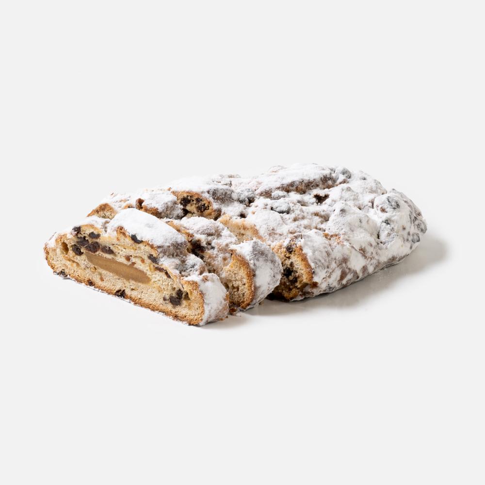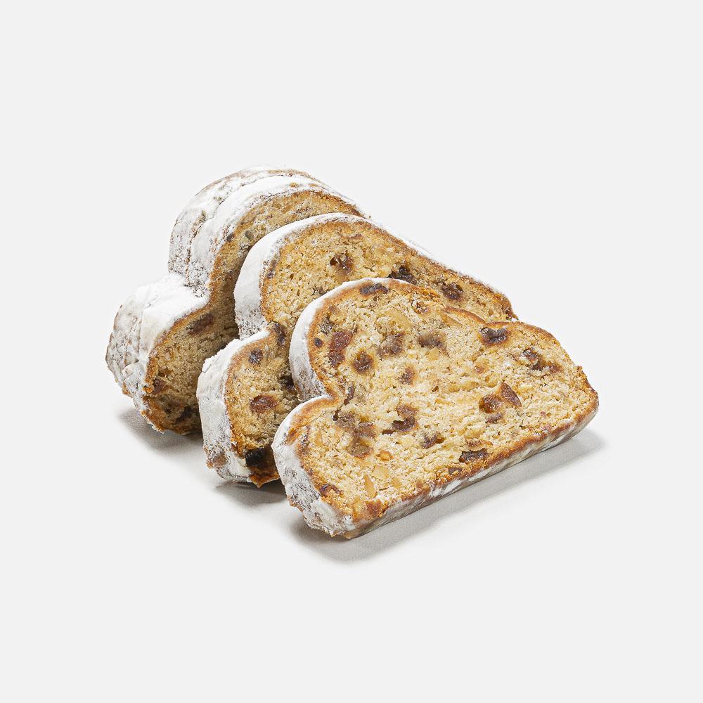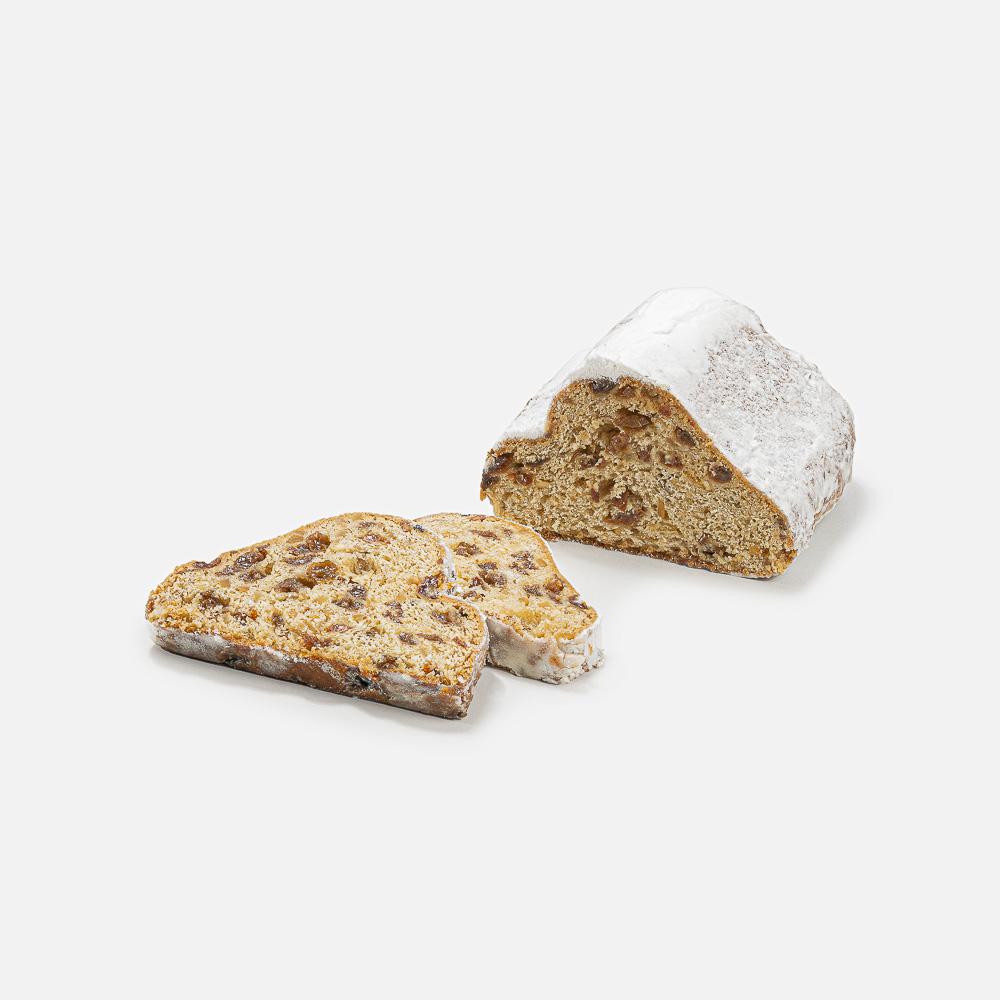 Saftige Butterstollen-Scheiben mit Rosinen, Orangeat, Mandeln und feiner Rumnote. Perfekte Portionsgröße für kleine Haushalte oder für den Genuss zwischendurch.